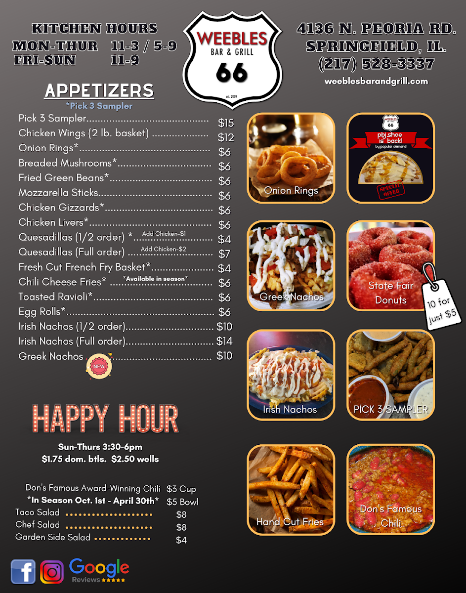 If you're in the mood for great food and a laid-back atmosphere, look no further than the Weebles Bar & Grill Menu. Nestled at 4136 N Peoria Rd in Springfield, IL, this spot is perfect for anyone craving a mix of classic comfort foods and bold flavors. From sizzling burgers and crispy fries to mouthwatering steaks, the menu here is packed with options that cater to every taste. Whether you're in for a casual meal with friends or a night out with family, there's something to satisfy everyone. Pair your meal with one of their signature drinks, and you're in for a treat. The variety on the menu ensures that every visit feels like a new experience, with just the right dish to match your cravings.
